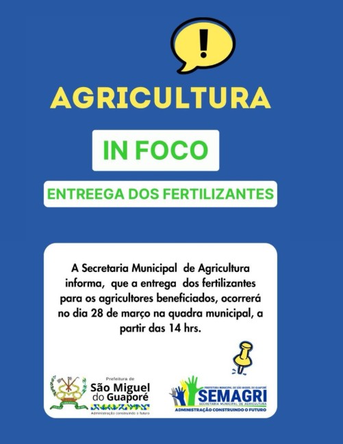 A Secretaria Municipal de Agricultura informa que a entrega dos fertilizantes para os agricultores beneficiados acontecerá no dia 28 de março, na quadra municipal, a partir das 14h.