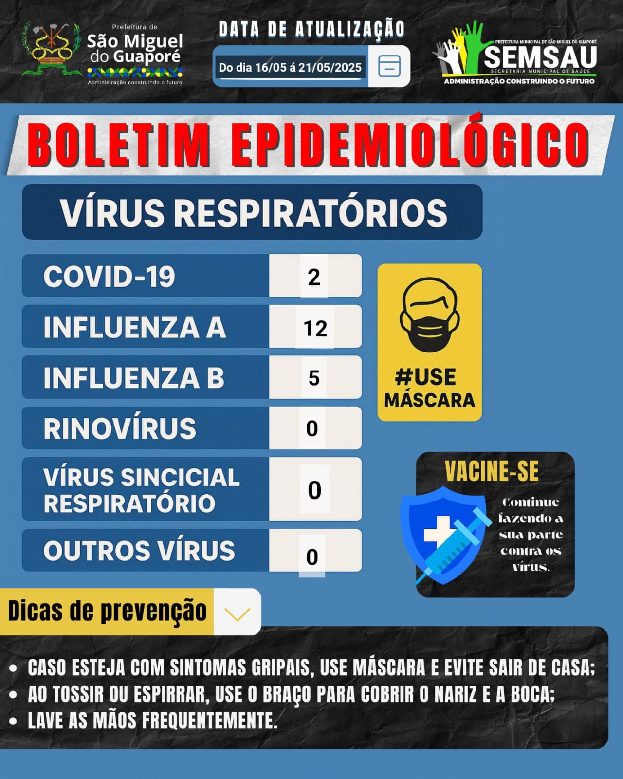 A Prefeitura de São Miguel do Guaporé, por meio da Secretaria Municipal de Saúde (SEMSAU), divulgou um novo boletim epidemiológico com os dados atualizados sobre os vírus respiratórios em circulação no município no período de 16 a 21 de maio de 2025.